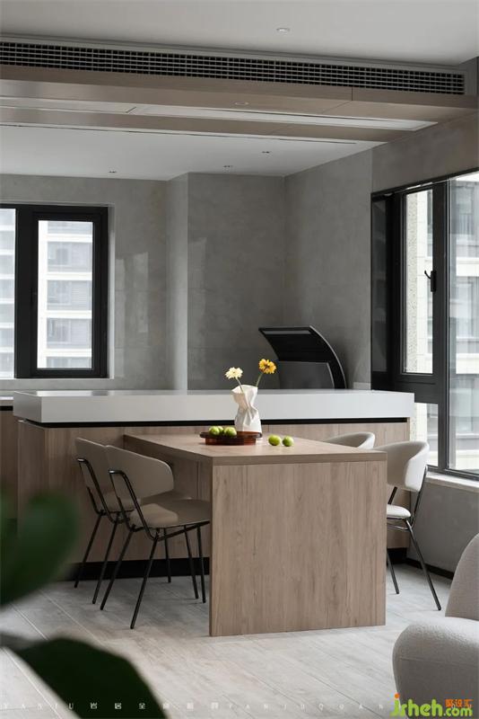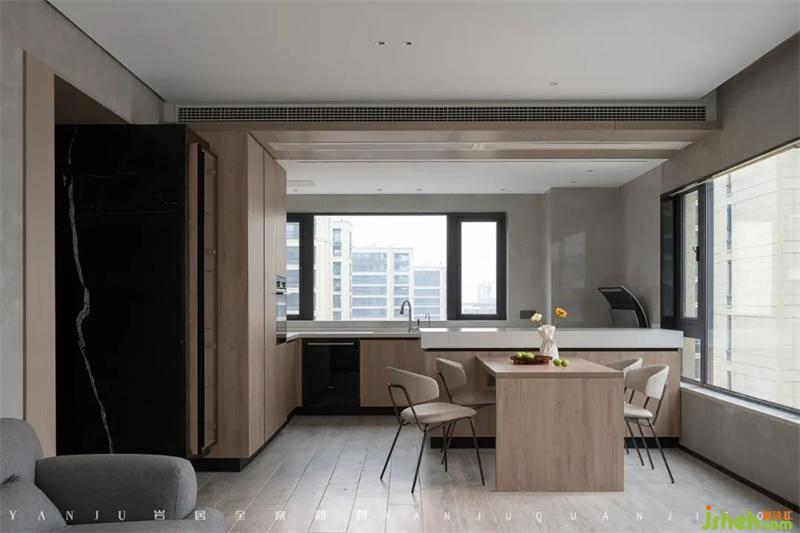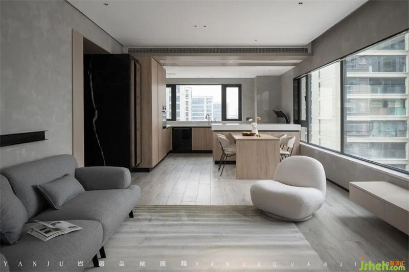 內包進來的陽臺做成了全落地窗的形式,一來優(yōu)化采光,二來方便公共區(qū)域的通風。