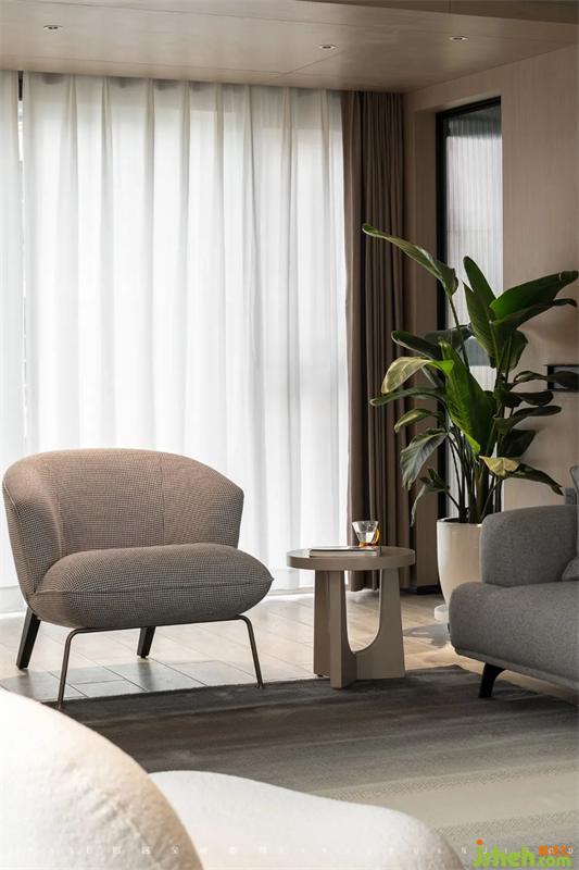 客廳布置簡潔,小型家具給家人留出更多活動空間,同時擴展視覺效果,顯得通透舒適。墻面木飾面板豐富空間層次,完善風格表達。