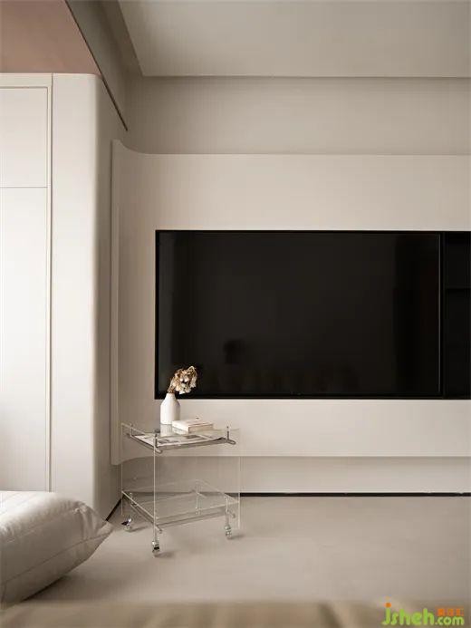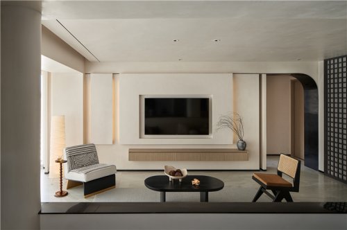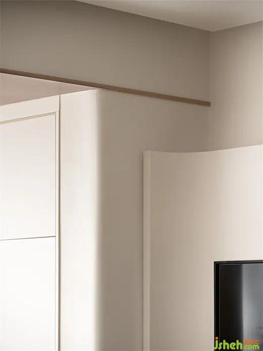 走廊圓弧造型與燈帶的設(shè)計(jì),不壓低層高的同時(shí)滿足了照明、造型,提升了空間的延伸感;而客廳電視背景墻的置物架也為走廊增添了美感。