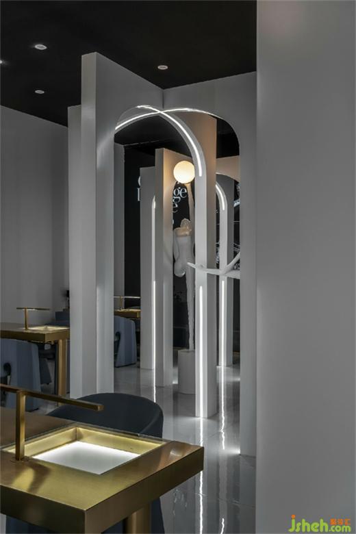 Different from other businesses, jewelry design emphasizes that the store design should interpret the brand attitude and aesthetic spirit with the most accurate language. As for the design of the store appearance, the designer arranges point-shaped LED lights in good order. The highly inlaid decorative technique made the lamp belt look like a shining auxiliary diamond, overflowing with dazzling brilliance, thus highlighting the professional tone of Rotass as a jewelry brand. Meanwhile, the designer sets up the transparent floor glass on a eight-meter-long display wall so that it can extend the graceful indoor scene and narrow the visual distance between people.