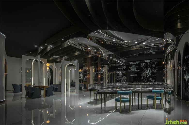 The function of the front hall, different from the traditional commercial display cabinets, is served as a area for customer reception and tea break. Sofa sets and seats are set along the side of the French window. The comfortable scene clearly distinguishes customized services from traditional business models. The ceiling decoration is a perfect combination of point, line and surface elements. The designer puts the light belt around the column in an irregular line shape, and the red light diffuses on the metal corrugated plate, artificially dispersing the light. The flowing light falls on the jewelry on display, highlighting the sparkling texture of diamond.
