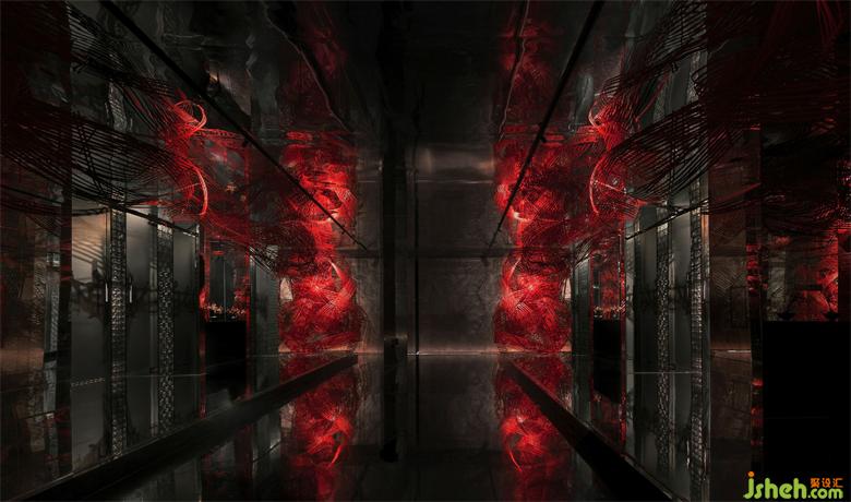 When entering the art corridor you’ll find a picture of sparse bamboo and moonlight shadow. The designer takes bamboo as raw material, and makes the hanging decoration of bright red geometry with artistic atmosphere. The modelling reflection of extremely rich visual tension is on the mirror surface wall, so that the light has the poetic charm.