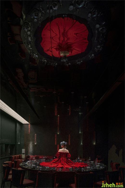藝術(shù)走廊呈現(xiàn)出一幅“疏竹月影”的圖景,成都餐廳設(shè)計師以四川盛產(chǎn)的竹子為原材料,定制成極富藝術(shù)氣息的大紅色幾何形吊飾。極富視覺張力的造型反射在鏡面墻壁上,疏落有致的的照影自有一番落月?lián)u情的詩韻。