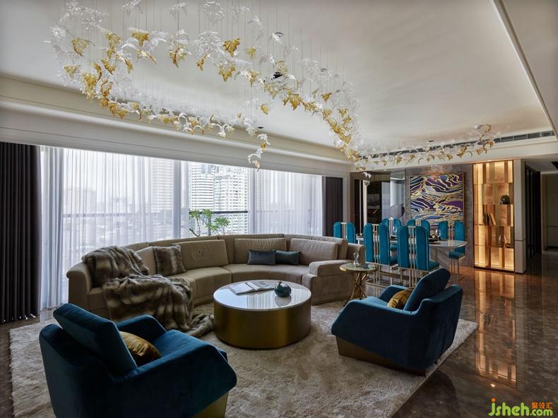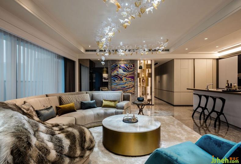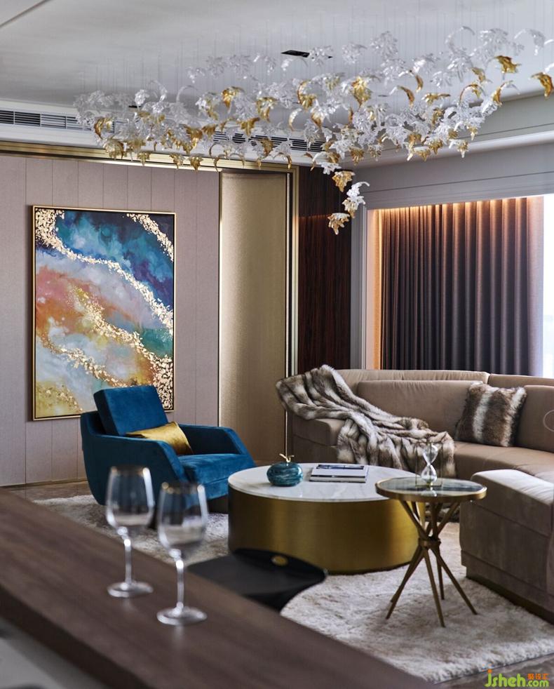 甫推開大門,手工精雕屏風(fēng)半掩玄關(guān),神秘奢華,隱藏不住該空間展示時尚意圖。金黃色夕陽透過大片落地窗灑落進(jìn)入客廳,反射在皮革家具上更顯斑斕奪目,空間色彩隨之緩緩流動,開啟與藝術(shù)品對話、以及當(dāng)代住宅設(shè)計(jì)的實(shí)驗(yàn)。