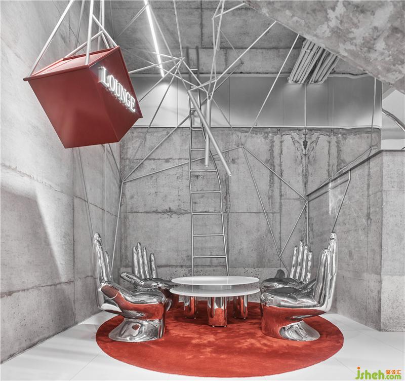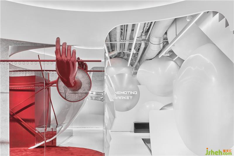 Conemoting market的空間敘述語言幾乎可以是放任的,寓言,幻覺,傷痛,童真,陷阱,曖昧,藥店,警告,科幻,撫慰,階梯,經典,劇情,可愛,黑白,紅色和欲望都被和諧地安置在一起,580平方米的空間是一個制造“線上人間”的劇場,在這里服裝高級地成為思想的表皮,咖啡可以是弄騷的道具,那么一樓的酒吧應該是通往魔界的火箭!