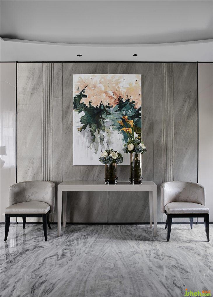 前廳進門(這是原先單套的客廳位置),映入眼簾的是一幅色彩變幻的抽象藝術畫,高雅大氣的花卉在其間若隱若現(xiàn)地浮動起來,延伸開來的是時而大面積分布、時而細膩如絲的大理石灰地面,將對稱性、平衡性與現(xiàn)代審美的創(chuàng)新性融入其中,展現(xiàn)著一場純粹的人與空間之間的靈魂對話。