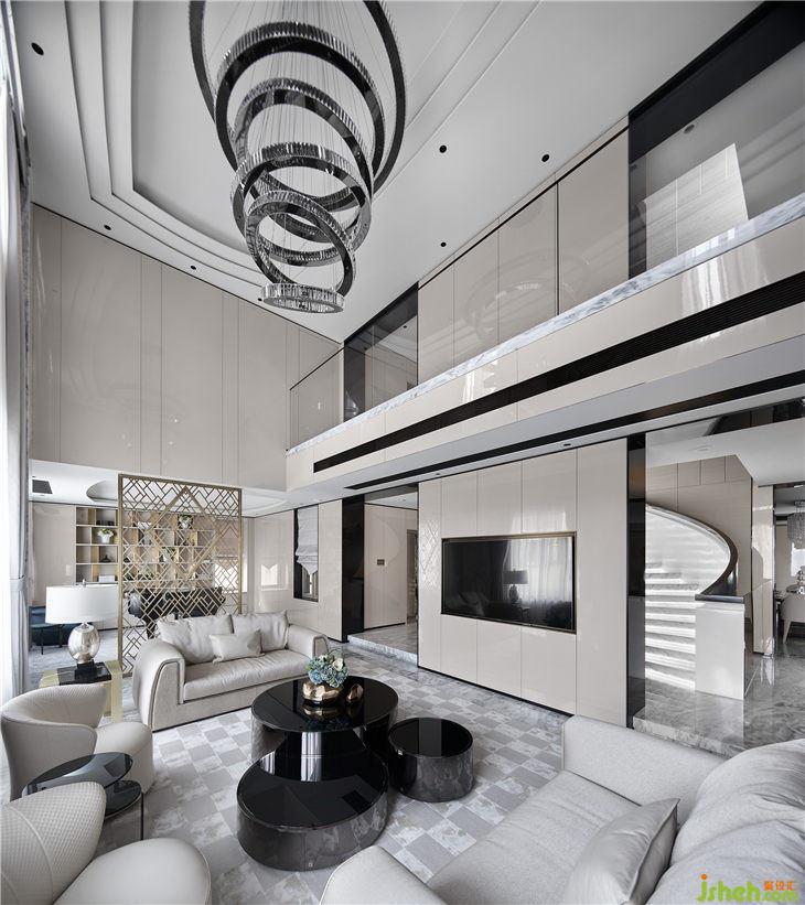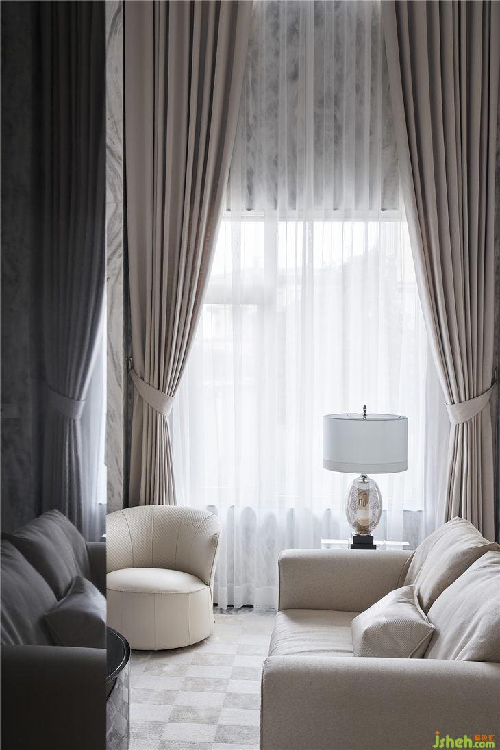 隨之進入客廳(這是原先兩套個自的門廳位置),中空挑高的設計帶來絕佳的視覺感官,落地窗承接著陽光的洗禮,極具流動線條感的大理石墻面,使整個空間干凈簡潔,呈現(xiàn)出雋永典雅的風格。米色系的多人沙發(fā)和窗簾,黑曜石般的角幾和茶幾,在自然光線的映射下產(chǎn)生鏈接,注入格紋狀的淺色系地毯,詮釋著極致奢華的當代風格。