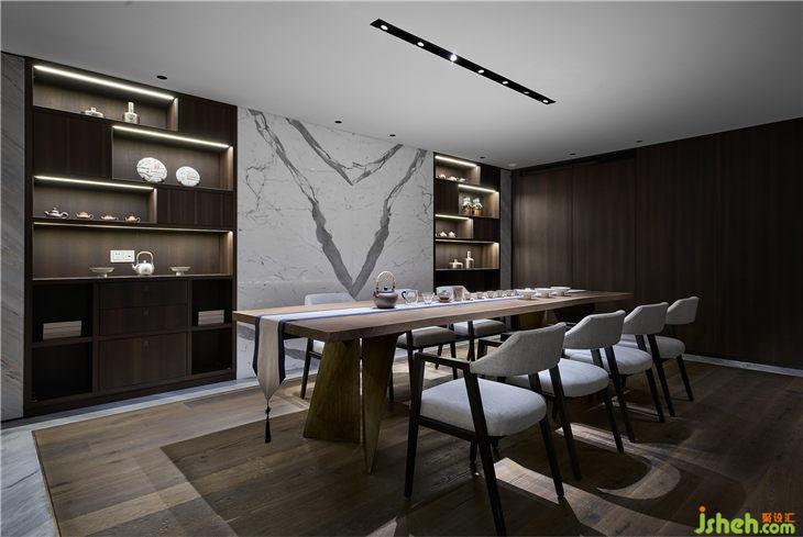 墻面用時(shí)尚的幾何切割手法,把石材做出低調(diào)而奢華的視覺(jué)感受,在隱藏形的光源配合下讓整體的光線變得更為柔和與靈動(dòng)。