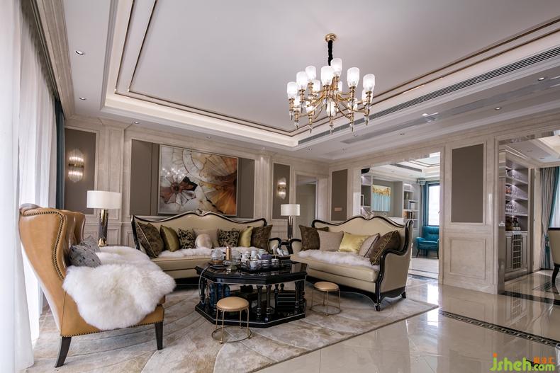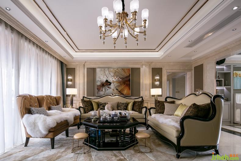 古典線條的沙發(fā)、藝術吊燈、水晶壁燈,彰顯出一種古典歐式的雅致韻味,而暗灰藍色的沙發(fā)窗簾、帶熱情橙系沙發(fā)以及帶有明亮感橙色系掛畫、與其空間有著“一脈相連”的溫暖。