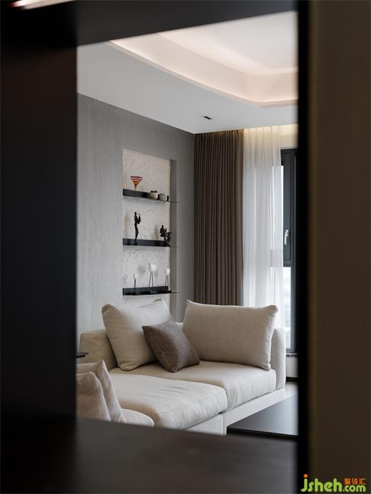 隔墻延伸出的鏤空柜體及綠色植物的融入,連接了玄關(guān)與客廳的互動,保護隱私但不封閉,營造出家輕松自然的氛圍。