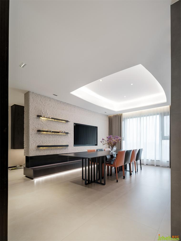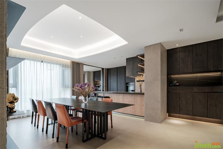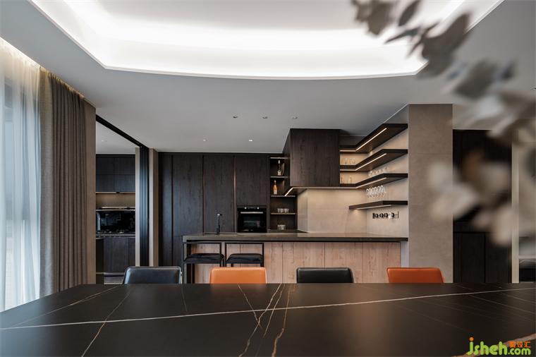 餐廚區(qū)維持色調(diào)統(tǒng)一時也讓暗色增多,色調(diào)下沉營造靜享美食的氛圍。餐區(qū)的荔枝面天然大理石與弧形天花,同客廳細節(jié)遙相呼應,橙黑餐椅平添幾分視覺的小驚喜。