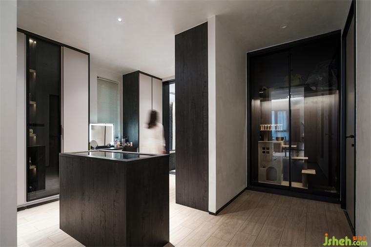 梳妝臺放置在衣帽間內(nèi),方便女主人在此化妝和搭配衣服。恒大御景半島裝修設計右側是家中愛寵的專屬空間,貓咪可以躲在此地玩耍打盹而不受打擾,也可經(jīng)過貓咪專屬通道進入臥室叫賴床的屋主起床。