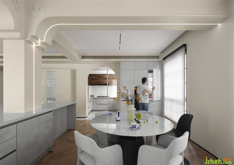 The open dining room carries its own deep meaning, unfolding the narrative of left and right with the convenience of life. On one side, an island with value and multi-functionality completes the daily connection with the living room, and on the other side, a direct access to the kitchen allows the whole process from ingredients to flavors to flow smoothly.Natural surroundings, natural flavors, artistic republics, and stories about fireworks are fleshed out to be more fascinating。