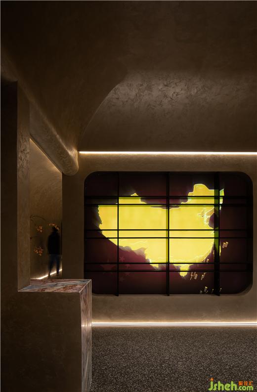 剝落微光浮動的外殼,空間的文藝氣質(zhì)由此涌現(xiàn)。室內(nèi)以深褐色為水泥為基底,空間動線迂回、轉(zhuǎn)折,讓顧客在探尋中不斷觸及園林文化的內(nèi)核,加深若即若離之感。