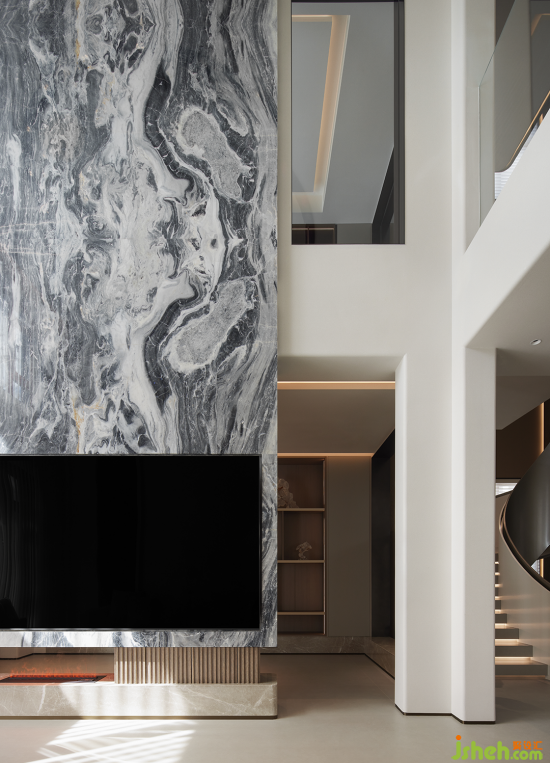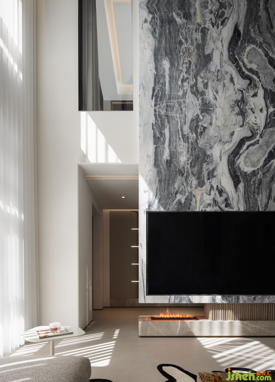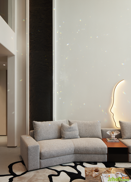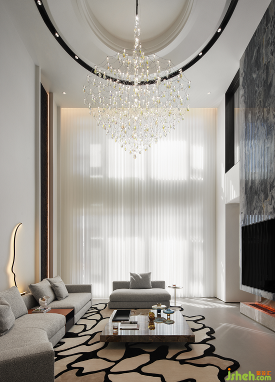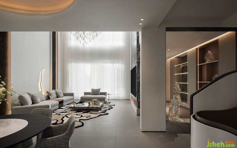 入戶歸家的氛圍充盈著白與灰低飽和但高級的色調(diào),結(jié)合簡潔的構(gòu)建線條,渲染出奢雅純粹的美學(xué)領(lǐng)域。晶瑩剔透的水晶吊燈聚焦空間,層疊映射的光圈平添了一抹詩意的驚喜。