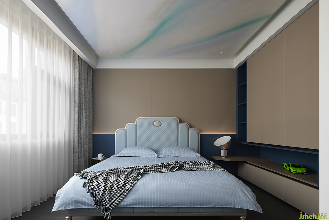 男孩房是以藍(lán)調(diào)適配棕色系的生活美學(xué),天花板的幾絲云霧、整體寢具飽含治愈……清新的感受蘊藏于細(xì)微之處,細(xì)枝末節(jié)處實現(xiàn)“人與住宅”的和諧共生。