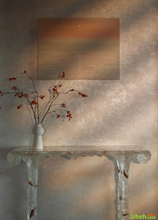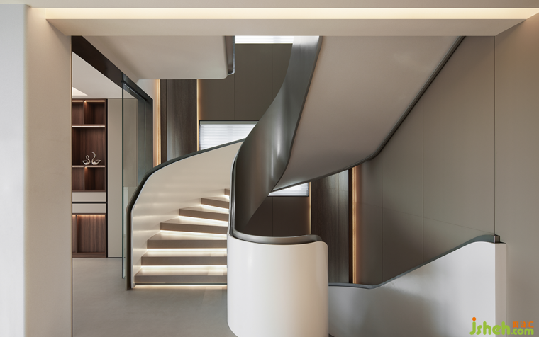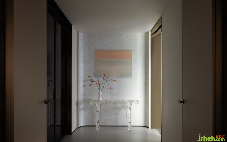 邁向位于三層的主臥,空間的層次感隨著步伐的推進(jìn)而愈發(fā)鮮明。瓷質(zhì)花瓶、玻璃桌臺與海上落日的油畫三者融合出藝術(shù)覺知,以簡而雅的線條構(gòu)造出返璞歸真的精神境界。落日余暉折射相臨,滿目皆是溫柔暖意。