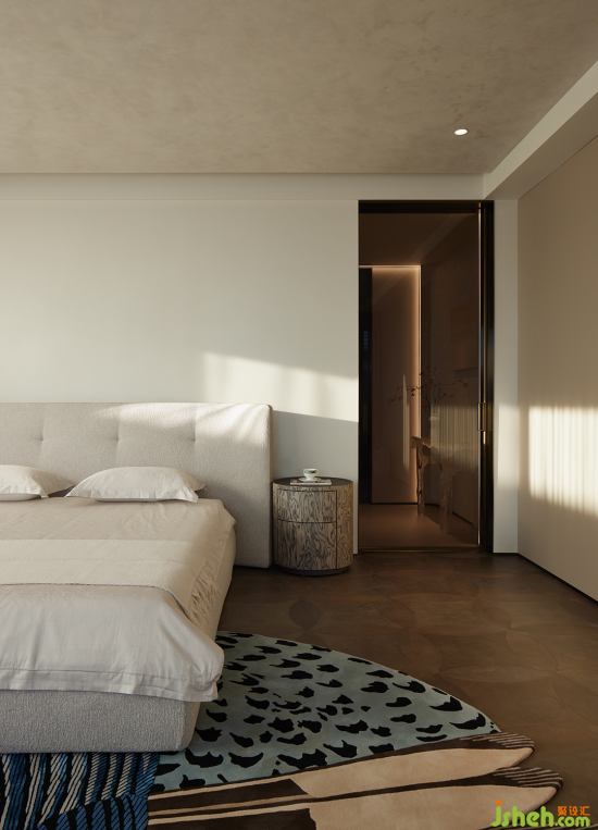主臥以純白色調(diào)放松所有身心,空間更多留給身體去參與和感受,海洋色系的地毯安定人心,白沙浮動的時刻,用身體、情感和心靈去“觀看”,才能真正獲得獨屬于自我的時刻。