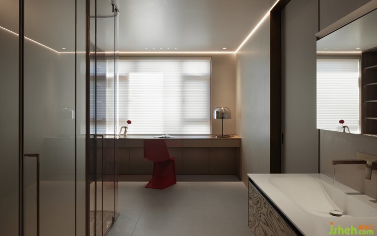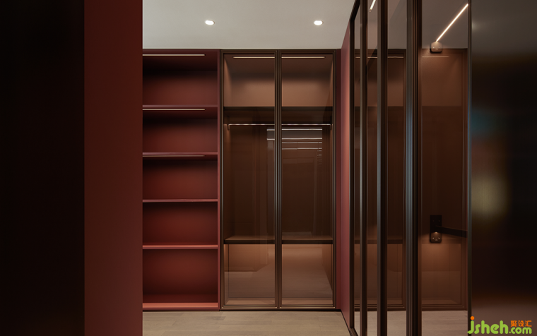 客臥之一以棕褐色調(diào)打造自然溫和的整體氛圍,褐色與紅色點綴在深邃的空間中更顯奢華,巧妙尋得完美的平衡。玻璃門衣柜簡約而不失高雅格調(diào),彰顯出大氣利落的質(zhì)感,秩序之中連接一日起居。