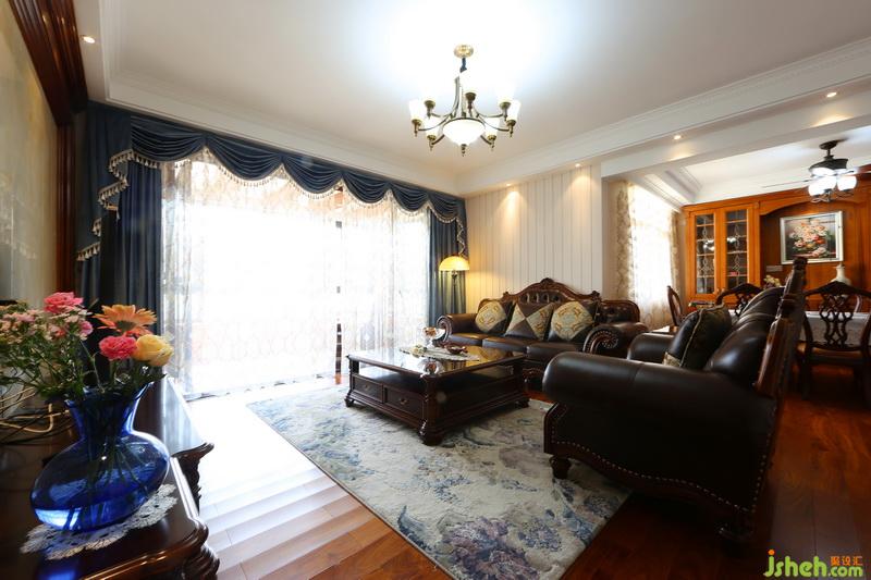 室內(nèi)設(shè)計師在客廳家具選用了古典美式經(jīng)典款式,來自意大利進口真皮搭配木色材質(zhì),將公共空間的基調(diào)確定,電視背景選用亮色素雅的墻面磚,讓空間輕重形成對比,增添一份華貴與神秘