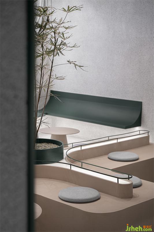 整體空間區(qū)域劃分不同,門口綠植和log的融合凸顯標(biāo)志性自然與健康的理念,門左邊玻璃的運(yùn)用使室內(nèi)通透性更強(qiáng),展示傳播產(chǎn)品制作過程,吸引路人。進(jìn)門右邊拍照打卡區(qū)不影響客人品茶聊天,左邊產(chǎn)品出品區(qū)客人隨時(shí)可觀看產(chǎn)品出品流程,也可品茶看窗外風(fēng)景