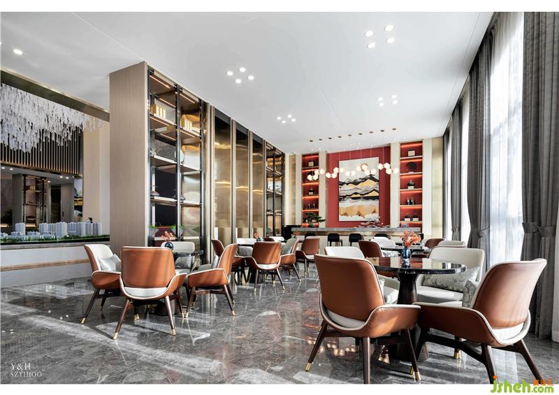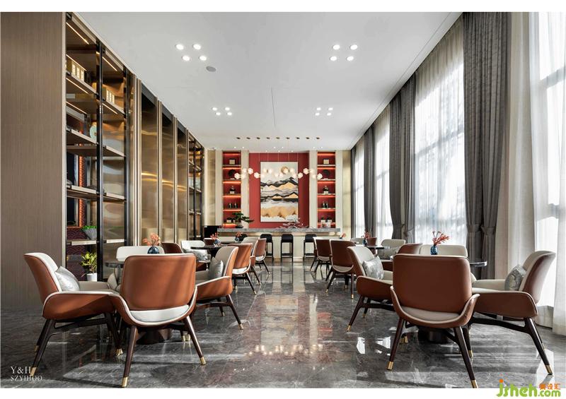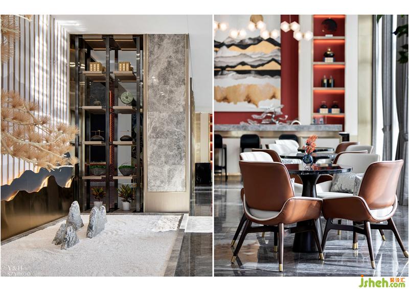 水吧區(qū)選用雅致的咖色皮革,讓空間暖而溫馨,墻面上的山水裝飾畫和吧臺(tái)上的藝術(shù)吊燈的曲線造型相映成趣, “山”“水”連綿渲染氛圍。