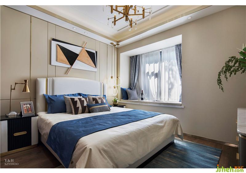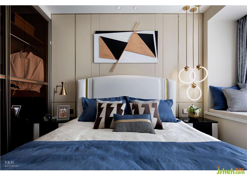 主臥摒棄繁復(fù)冗雜的擺設(shè),用簡潔明了的語言勾勒出生活的質(zhì)感,富有創(chuàng)造力的幾何掛畫增添空間的藝術(shù)內(nèi)涵。抱枕與地毯深淺不一的藍(lán)色,避免了色調(diào)的單一,使主臥空間層次感加強(qiáng)。