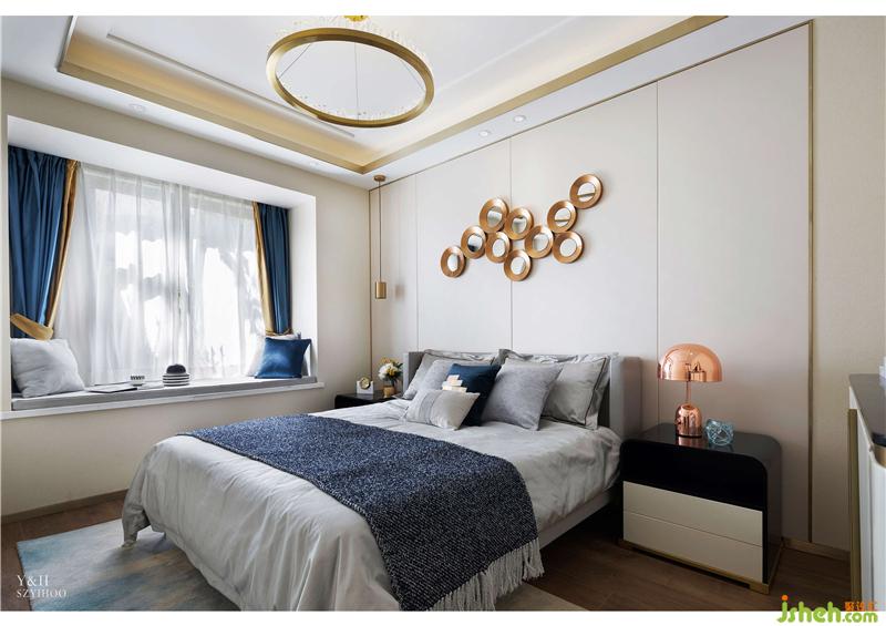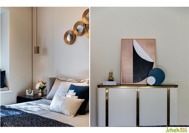 長輩房間的黃銅小吊燈與設(shè)計(jì)感十足的不規(guī)則金屬掛鏡。