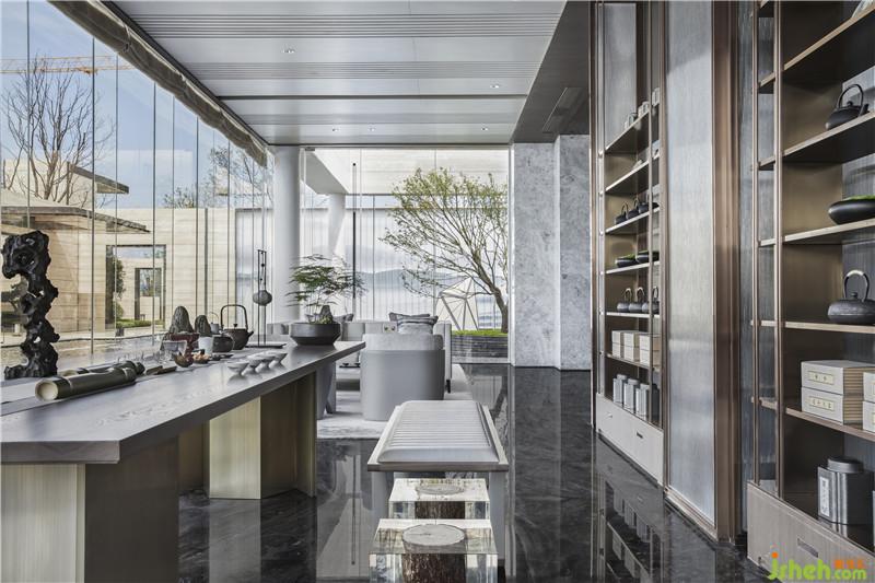 純粹的線條結(jié)構(gòu)在空間內(nèi)全方位地構(gòu)建,頂部的木柵條將自然光引入空間,強調(diào)線條感的燈飾與下方沙盤區(qū)形成呼應(yīng)對立,仿佛連成一體的裝置,暗將藝術(shù)感融入到空間的展示中。東方文化中所特別強調(diào)的“含蓄”被精準地表現(xiàn)于此,含而不露、不動聲色的力道,既豐盈亦懂得節(jié)制。