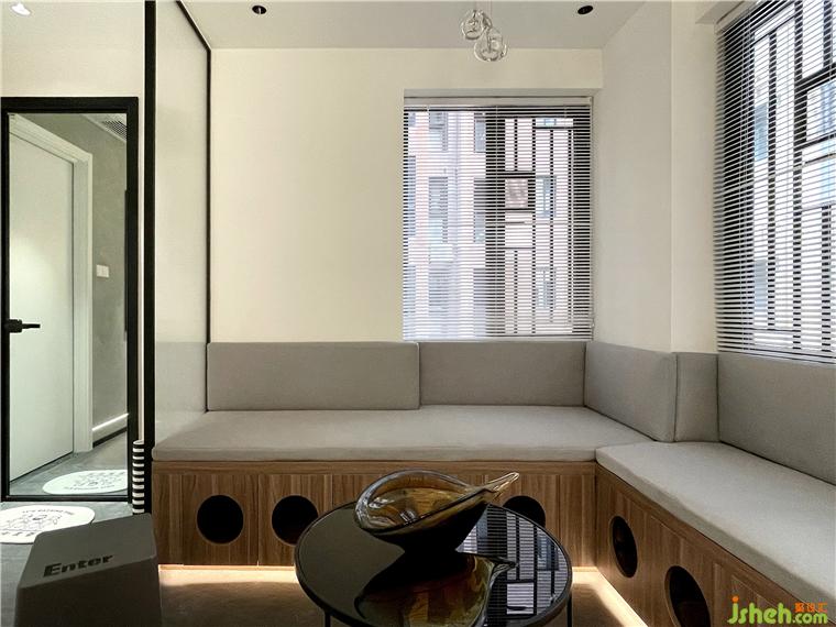 在過道口設計推拉門,當其打開時,客餐廳與內部的臥室,多功能廳都是相互敞開的狀態(tài),展現了其的開放性,當其閉合時,各個空間又相互獨立,保證了私密性。