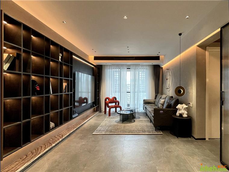 推拉門形成一個面,延長推拉門暗藏軌道做成燈帶形成線,線與面的結合,面于線上移動,同時在電視背景墻頂上設計一條平行燈帶形成兩條相互平行的長線,深圳家居設計既解決了照明問題,增加了空間的氛圍感,也讓整個空間多了一分張力。