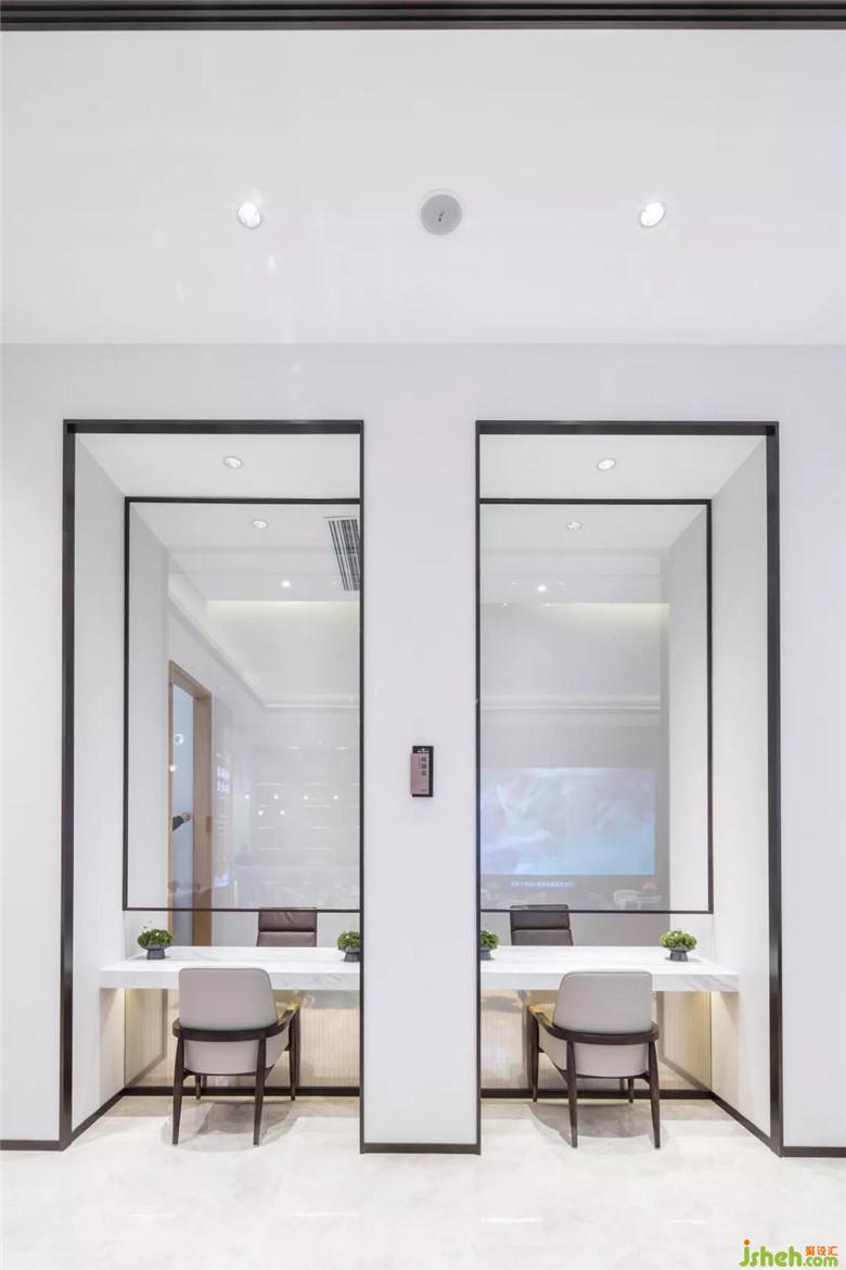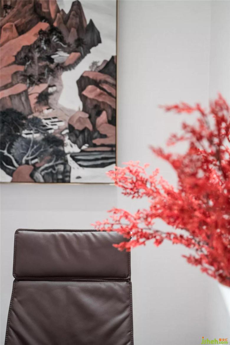 穿過(guò)朗闊的洽談區(qū)空間,是體量并不大的簽約室。墻畫(huà)中的山川倒影擔(dān)起空間純粹而寫(xiě)意的美感,家具造型的簡(jiǎn)潔提供了當(dāng)代東方的藝術(shù)張力。