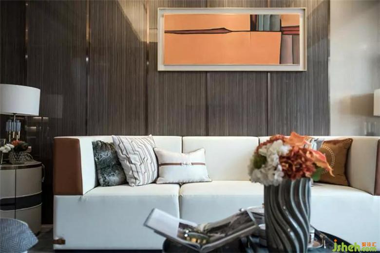 步入客廳,色調(diào)以弱對比的層次變化在空間循序變幻,夾絲玻璃背景墻,以一幅抽象元素掛畫作為空間內(nèi)點綴,同時空間陳設(shè)以低飽和度色彩相互組合,整個空間在以橘色作為點綴色的襯托下營造了一份低奢、內(nèi)涵的紳士空間。