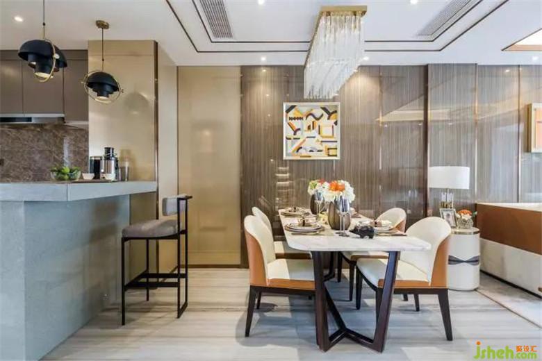 餐桌臺面選取雅士白大理石,天然石材的自然紋路,搭配大束繡球花藝組合。餐巾餐扣選取金屬馬鞍扣造型,組合圓點陣列構(gòu)成的餐盤,使得整個臺面大方有序且不失精致。方形底盒吊燈搭配三棱水晶柱,風(fēng)影變換之下產(chǎn)生粼粼波動。