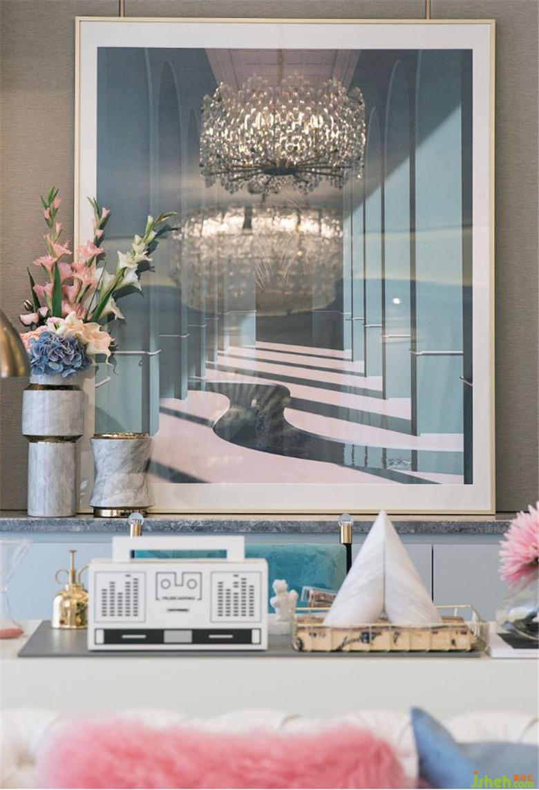 進(jìn)入客廳,宛如感受了現(xiàn)代與上世紀(jì)初巴黎藝術(shù)風(fēng)格在此邂逅,灰藍(lán)色與粉色構(gòu)成強(qiáng)烈的對(duì)比,通過(guò)水晶燈具的搭配,渲染上一層奢華情調(diào),做工精巧的飾品、金屬線條的燈具,碰撞出極具韻律感的視覺(jué)沖擊,無(wú)不散發(fā)著奢華、雅致的空間氣質(zhì)