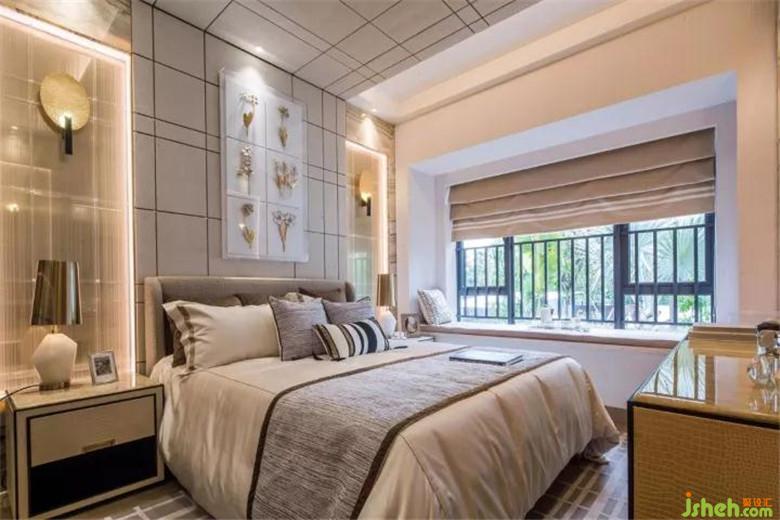 步入主臥,大空間帶給人一種十分舒服的空間感,金色燈飾和花藝構(gòu)成工藝畫相互結(jié)合起到了提亮空間的作用,縱橫交錯(cuò)的金線條與掛畫相互輝映,給人帶來一種突破常規(guī)的感覺。