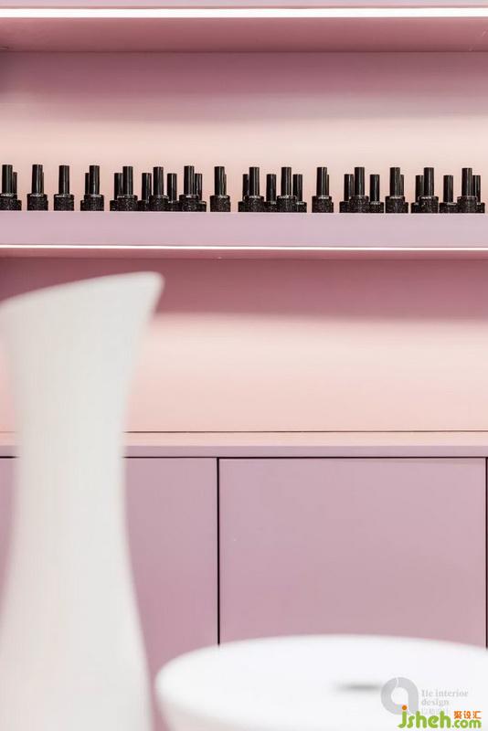 在功能布局上,我們采用了公共區(qū)域完全開放式的設(shè)計(jì),接待、等候、洽淡、美甲都在一個(gè)區(qū)域,因?yàn)槭且粋€(gè)長條形的格局,如果每個(gè)功能都分開,空間利用會特別浪費(fèi),另外我們也是希望通過這種方式來嘗試讓空間有一種不同的經(jīng)營方式。
