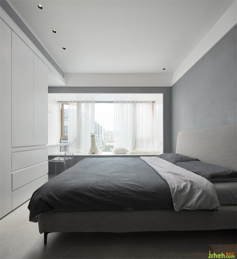 主臥延續(xù)了整屋的灰,水泥灰提升空間的質(zhì)感和舒適度,灰色背景和床體色調(diào)一致,簡(jiǎn)約大氣,給人一種寧?kù)o舒適的居家氛圍。