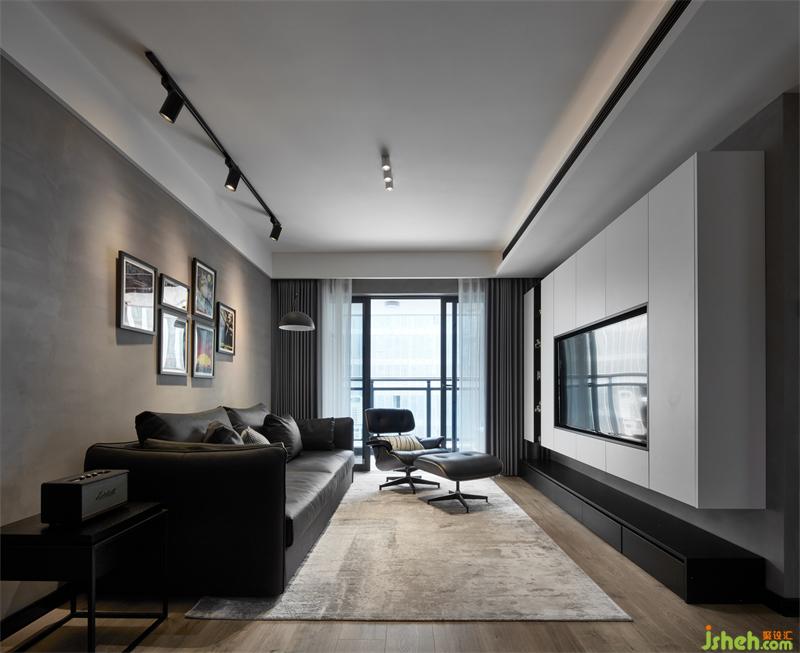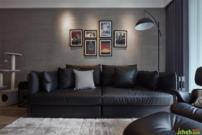 將家人喜愛的海報劇照作為裝飾畫,讓空間多了一絲趣味,中和了工業(yè)水泥灰墻面的冷硬感和黑色落地沙發(fā)的厚重感,搭配射燈與落地燈,為理性的空間增添一絲家的溫暖。