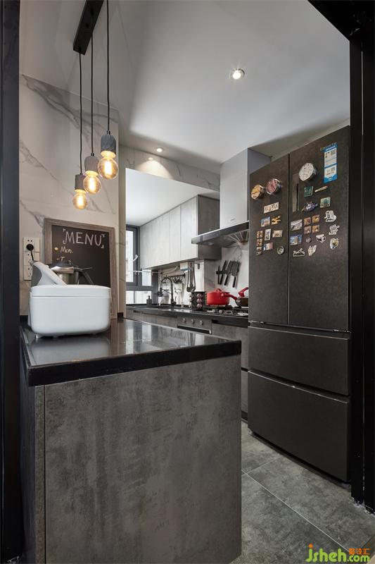 陽臺一側(cè)定制整墻儲物柜,嵌入洗衣設備與洗手臺,滿足屋主需求。洗衣臺底部抬高設計,防止洗衣機和柜體受潮,高級的灰色調(diào)鋪滿墻面地面,搭配深灰色柜體,表現(xiàn)得耐看而有層次感。