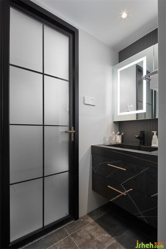 客衛(wèi)將干區(qū)洗漱臺單獨分離出來,定制懸空式臺上盆浴室柜,黑色大理石巖板完美呈現(xiàn)了石材的原生紋理,讓整個空間時尚感爆棚。