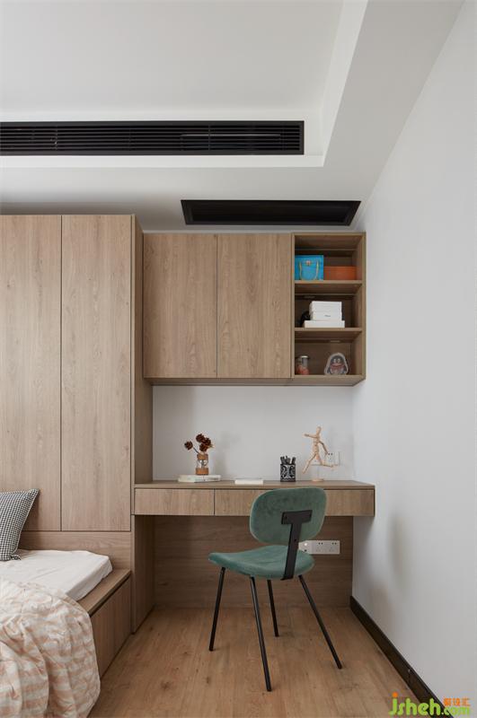老人房將榻榻米床與衣柜書桌一體化設計,充分利用每1㎡,收納空間翻倍。無把手的原木家具,沒有過多裝飾,整體給人以自然清新的氛圍感。