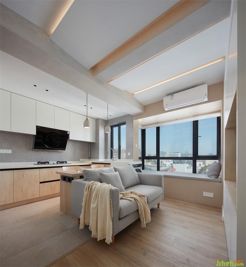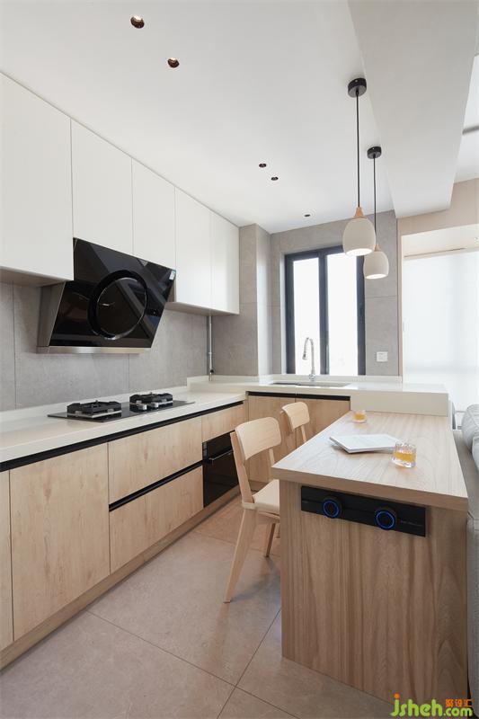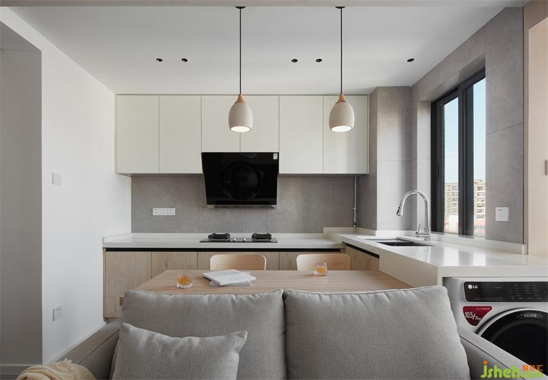 淺色系的廚房,干凈明亮,一個最為煙火氣的地方,也因敞亮的格局而明媚。
