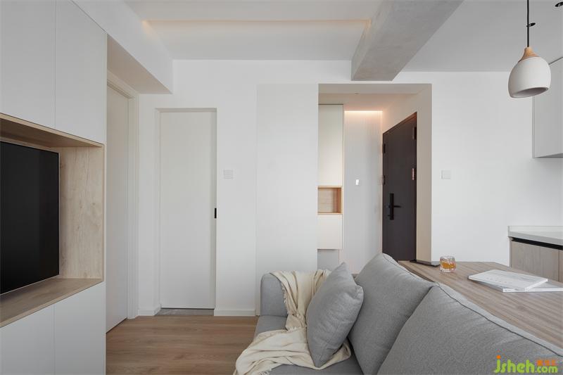 最大化利用空間做收納電視柜鏤空以原木色打破單調視覺,定制了一整面墻的電視柜,配色上沿用白色+原木這對好cp,不僅顏值出眾,儲物能力更是max。