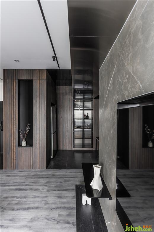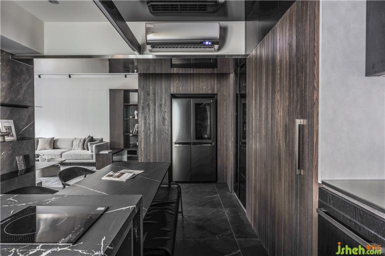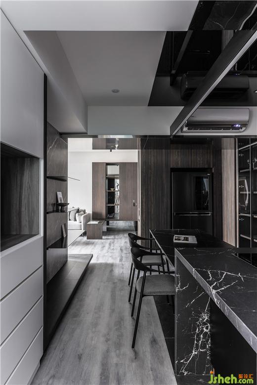 餐廳的氛圍獨特,運用異材質(zhì)本身的低彩度與肌理,鋪陳出沉穩(wěn)內(nèi)斂的質(zhì)地之美。墻面與柜體挑選不同深淺的實木,中島與用餐區(qū)混搭了多種紋樣的石材,一抹霧化的金屬光澤適度的引入,材質(zhì)共融的形式跳脫了呆板的框架,緩和深色空間的沉重感。天花的黑鏡延伸了場域的尺度,倒映著料理時的專注神情,以及共餐時的談笑細(xì)語,生活的想象原來是如此的立體有溫度。