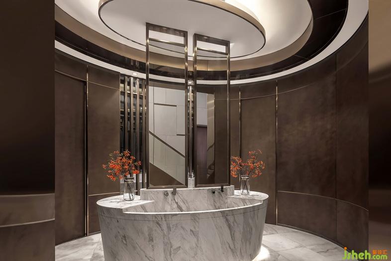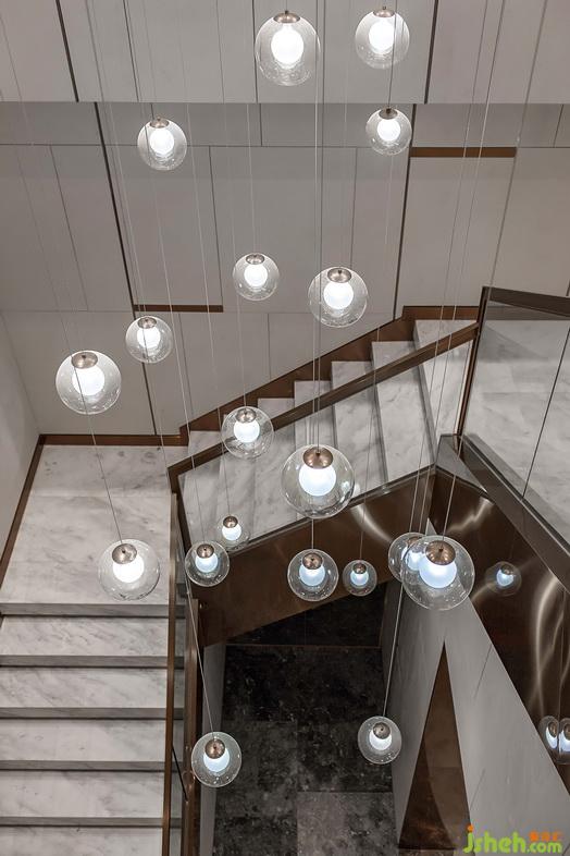 樓梯間采用大理石、玻璃與鋼材的結合,簡潔現(xiàn)代。錯落有致的玻璃燈飾垂于中央,盤旋樓梯而上時,星星點點,美不勝收。洗手間橢圓造型的圍合形態(tài)營造出空間的通透性,隔而不斷。