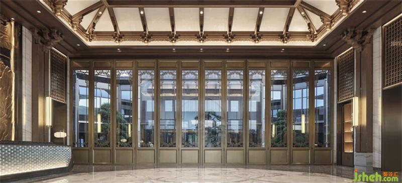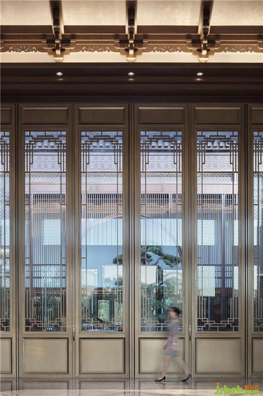 接待區(qū)中庭高達(dá)9米,八邊形元素被巧妙融入到天花、地面和墻面中,四方一統(tǒng),八面來客,展現(xiàn)”嶺南福邸“的概念。天花借用中國(guó)傳統(tǒng)建筑中樑架結(jié)構(gòu)和藻井形式加以演變?cè)煨停窕皞鹘y(tǒng)中式圖樣紋案被運(yùn)用于其中,與四根斗拱構(gòu)架的柱式結(jié)構(gòu)和八邊形地面相呼應(yīng)。裝修設(shè)計(jì)