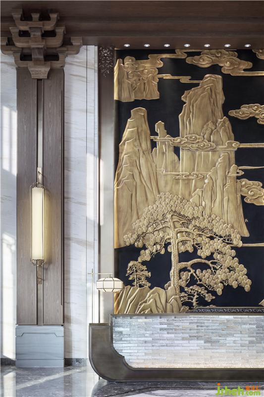 接待區(qū)內(nèi)注重空間的序列感和儀式感,以寓意福祿吉祥的金碧色調(diào)作主調(diào),同時(shí)又巧妙融入中式傳統(tǒng)的借景與對(duì)景的園林造景手法。