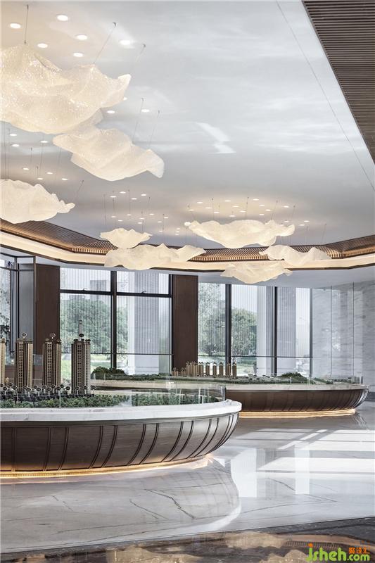 模型圖后另設(shè)山水紋水晶玻璃屏風(fēng),繁縟而有節(jié),化為映像的細(xì)聲,既是美的展示,又適宜空間的分割,影影綽綽之間感受“清風(fēng)徐來,水波不興”之境。裝修設(shè)計(jì)