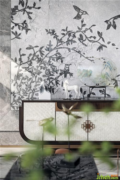 客廳主背景墻以《鬧春》為主題概念,采用了3.2米高復(fù)合工藝花鳥石材背景墻,光面、水洗及噴挖三種工藝,讓石材呈現(xiàn)出具有肌理感的表面,結(jié)合花鳥圖案,展現(xiàn)空間的主題與雅致格調(diào)。雙層透疊藝術(shù)玻璃屏風(fēng),與庭院虛實掩映。